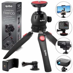 The qubo Mini Tripod – Multifunctional and Expandable! In The Box: Tripod 2-section legs Ball head panoramic 360° Phone holder GoPro mount Instruction Fasteners 1/4′ screw Max load: 2